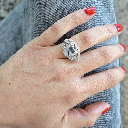 ANILLO VINTAGE RECTANGULAR DE PLATA 925 ITALIANA RODINADA Y CRYSTALES