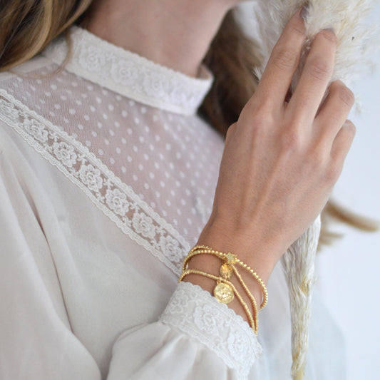 PULSERA MOSTACILLA BAÑO DE ORO Y MEDALLA VIRGEN DE LOS RAYOS CRYSTALES